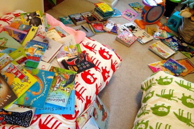 As you can guess, some books work better than others at holding their attention, or mine. We have a LOT of books. It’s a library, that when one shelf is spilled on the floor for re-decorating, looks like this.